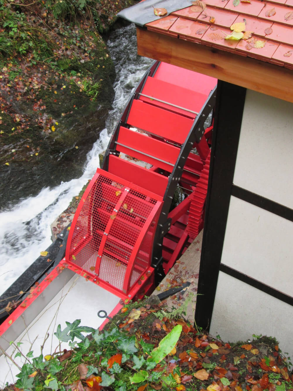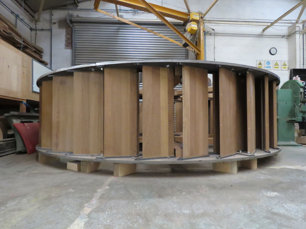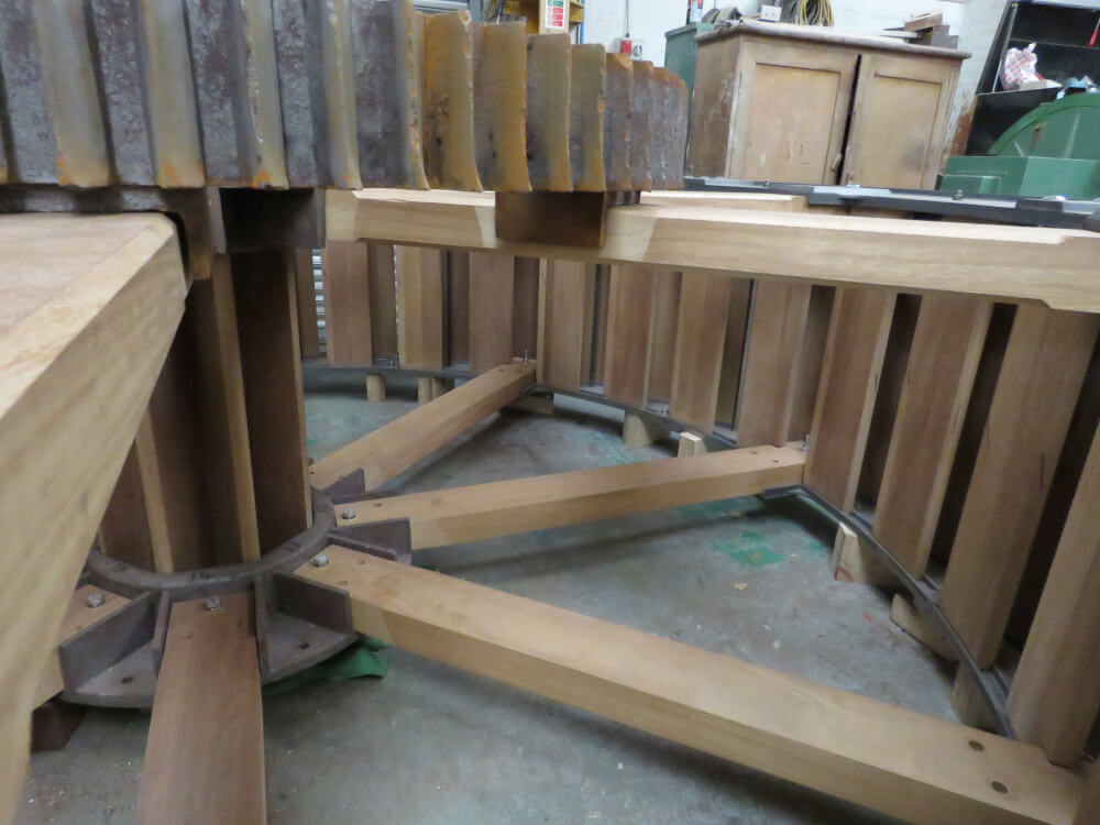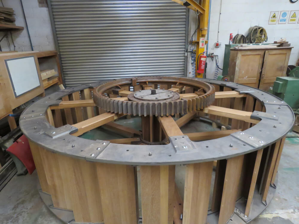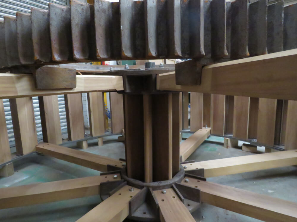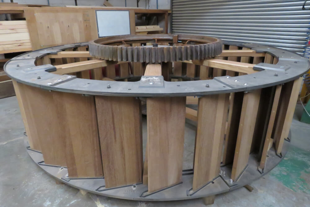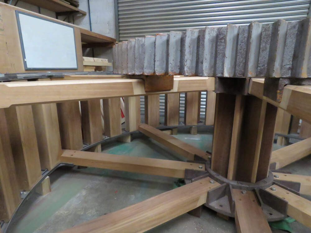 Each timber part on the waterwheel was replaced with solid Iroko hardwood. We also replaced the outer cast rings in which the pattern can be seen in the pictures.